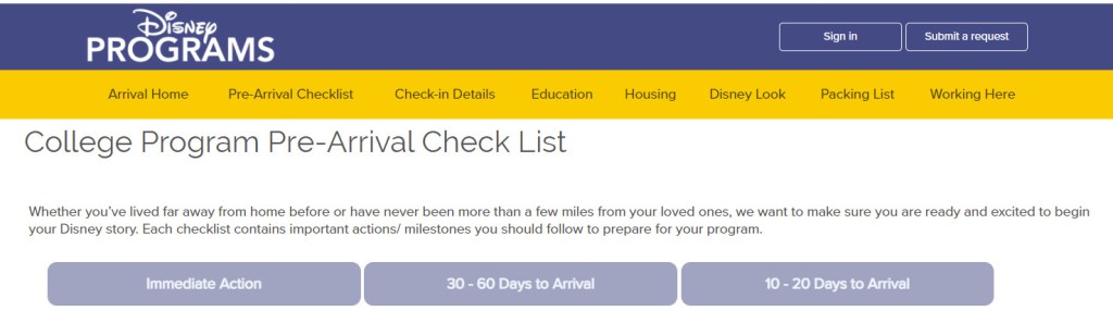 When it comes to preparing for any Disney Program, in addition to your personal organization preferences, I highly recommend utilizing Disney Program’s Arrival Preparation and Arrival Day Web Page. The Disney Programs website is excellent at providing resources, to help new arrivals prepare for their program and answering frequently asked questions. Before arrival day, they can’t provide answers to everything just yet, more and more information is revealed as the arrival date gets closer. The Arrival Preparation Page offers links including details on accommodations, pre-arrival tips, registering for DORMS (Disney’s On-Site Resident Management Systems), how arrival day will generally look and my personal favorite, a break down timeline of when to do what for the program. The list is broken down by time periods from immediate action, what to do 30-60 days before arrival and what to do 10-20 days before arrival.